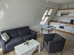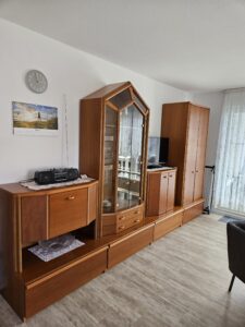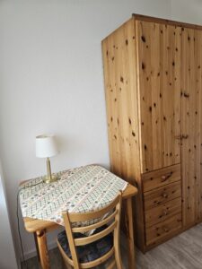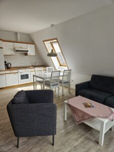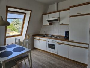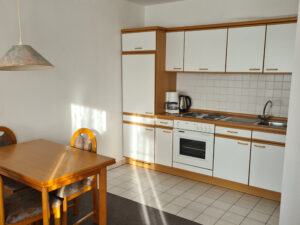 Küchenzeile mit Kühlschrank inkl. Eisfach, Elektroherd, Backofen, Kaffeemaschine, Wasserkocher, Toaster und auf Wunsch ein Mikrowellengerät.